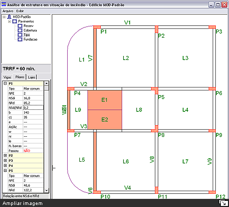 O cálculo da força normal de cálculo em situação de incêndio (NSdi), necessária para a verificação de pilares, é efetuado de forma automática pelo sistema a partir dos resultados obtidos do processamento do pórtico espacial ELU. É possível definir a espessura e o tipo de material de revestimentos padrões para vigas, pilares e lajes. Os valores definidos serão adotados em todos os elementos presentes no edifício. Na verificação dos pilares pode ser utilizada a proposta do Prof. Valdir Pignatta publicada no artigo do Ibracon. TabelasTodos os valores presentes nas tabelas da NBR 15200, bem como na proposta do Prof. Valdir Pignatta já referenciada anteriormente, estão parametrizados, e podem ser livremente editados pelo Engenheiro. ProcessamentoA avaliação de toda a estrutura em situação de incêndio é realizada por um único comando no Gerenciador. São verificados todos os elementos (vigas, lajes e pilares) respeitando-se o detalhamento de suas armaduras e os critérios de projeto adotados pelo Engenheiro. RelatórioOs dados adotados e resultados obtidos durante a verificação da estrutura em situação de incêndio são apresentados num relatório completo. Visualizador gráficoAlém do relatório, os dados e resultados da verificação da estrutura em situação de incêndio também podem ser facilmente avaliados e otimizados por meio de um visualizador gráfico especialmente desenvolvido para este fim. Os elementos que não passaram na verificação são coloridos na cor vermelha. É possível selecioná-los (pilar, viga ou laje), clicando-se com o mouse diretamente sobre a janela gráfica, ou nas tabelas ao lado. Em cada uma destas tabelas, são apresentados todos os dados e resultados pertinentes na verificação de cada elemento. A grande maioria dos dados pode ser livremente editada pelo Engenheiro. A qualquer alteração, o programa automaticamente reverificará o elemento editado instantaneamente.