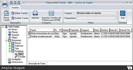 Cada tarefa no projeto possui uma prioridade de execução, status de acompanhamento e uma previsão de início e término, criando assim, de forma cronológica as ações a serem efetuadas dentro de um projeto de edifício. Visualização de TarefasA visualização das tarefas cadastradas pode ser feita pelos usuários com o auxílio de filtros de visualização, facilitando a procura por determinados itens. Além dos filtros, é possível a ordenação de acordo com os dados de cada uma das colunas.