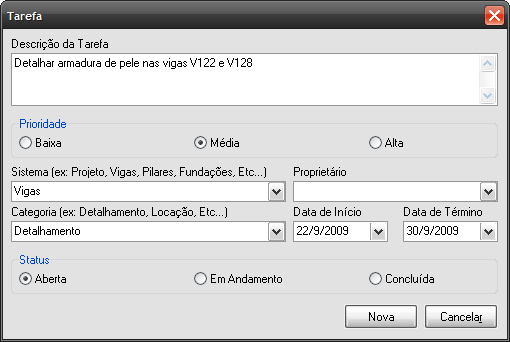 A ferramenta "Tarefas de Projeto" permite ao usuário cadastrar e gerenciar uma lista de tarefas do projeto, mantendo informações que considere importante de serem guardadas durante a elaboração do mesmo. Essas tarefas podem ser categorizadas e divididas em sistemas de interesse e atribuídas dentro do contexto do edifício facilitando posteriormente a sua localização. Criação de TarefasNa criação de uma nova tarefa pode-se definir elementos de controle como: